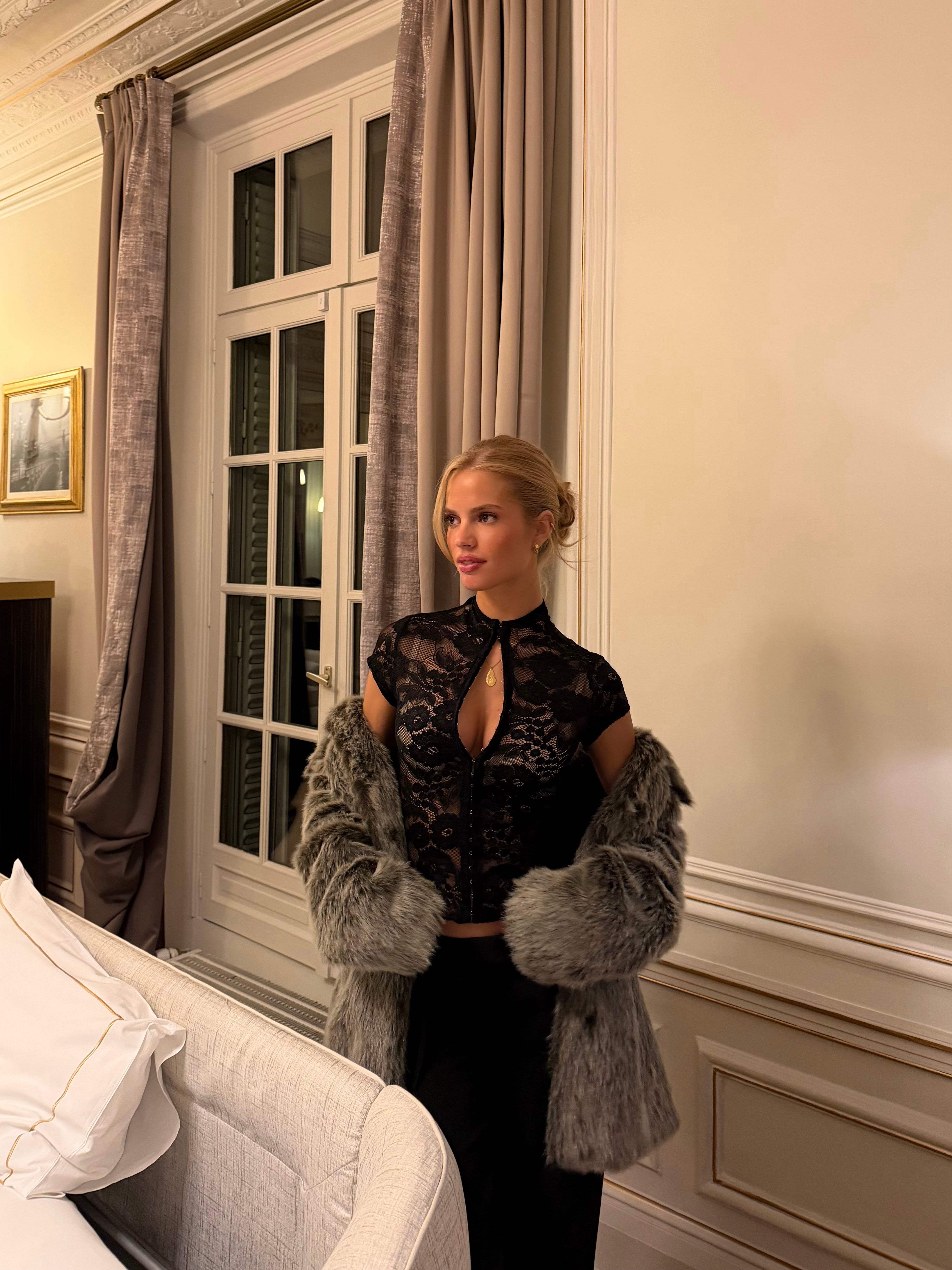 Elegant lace top that fastens with hooks from bottom to neck. The top can be fastened in different ways and have openings depending on preference and occasion.