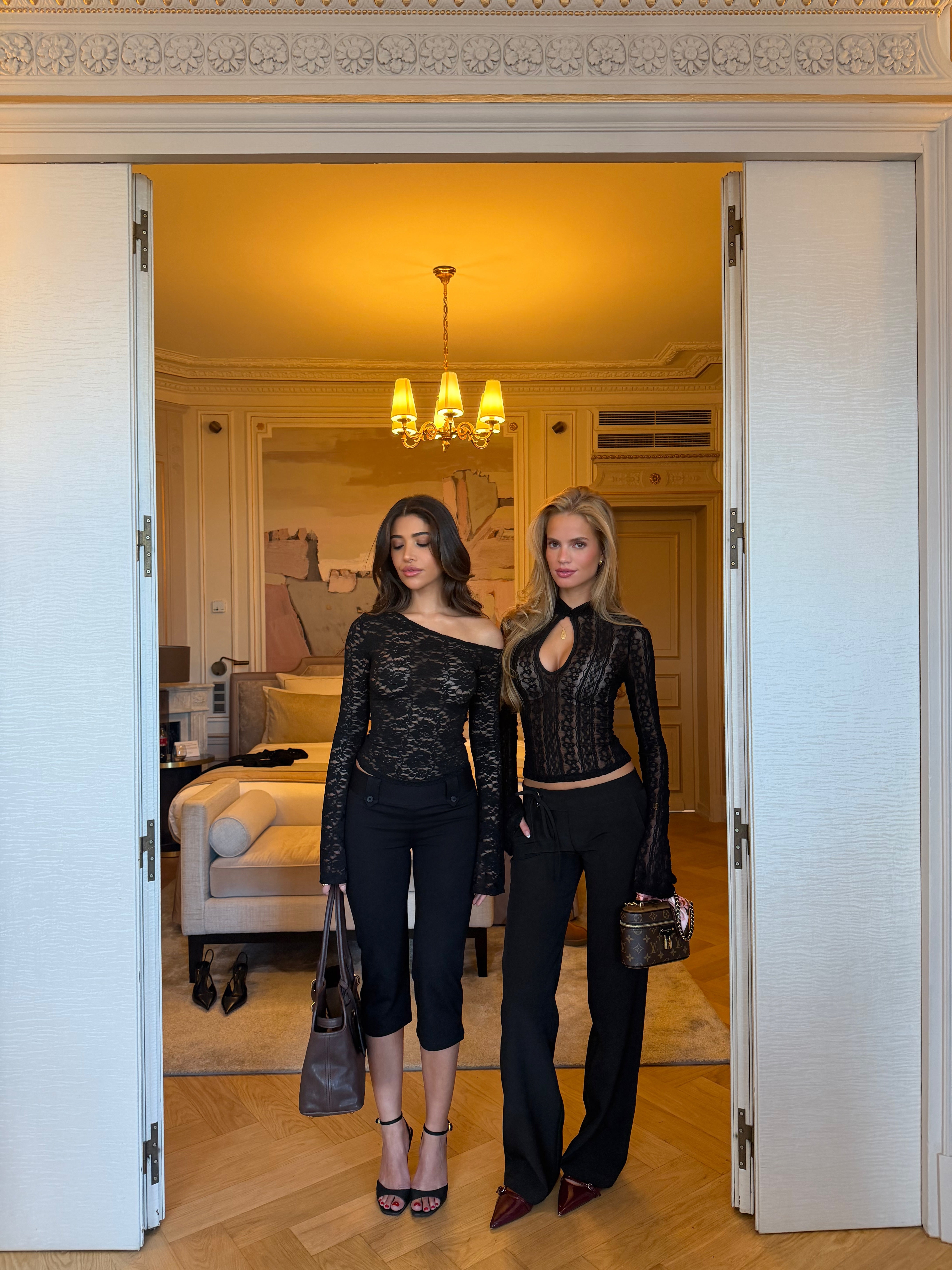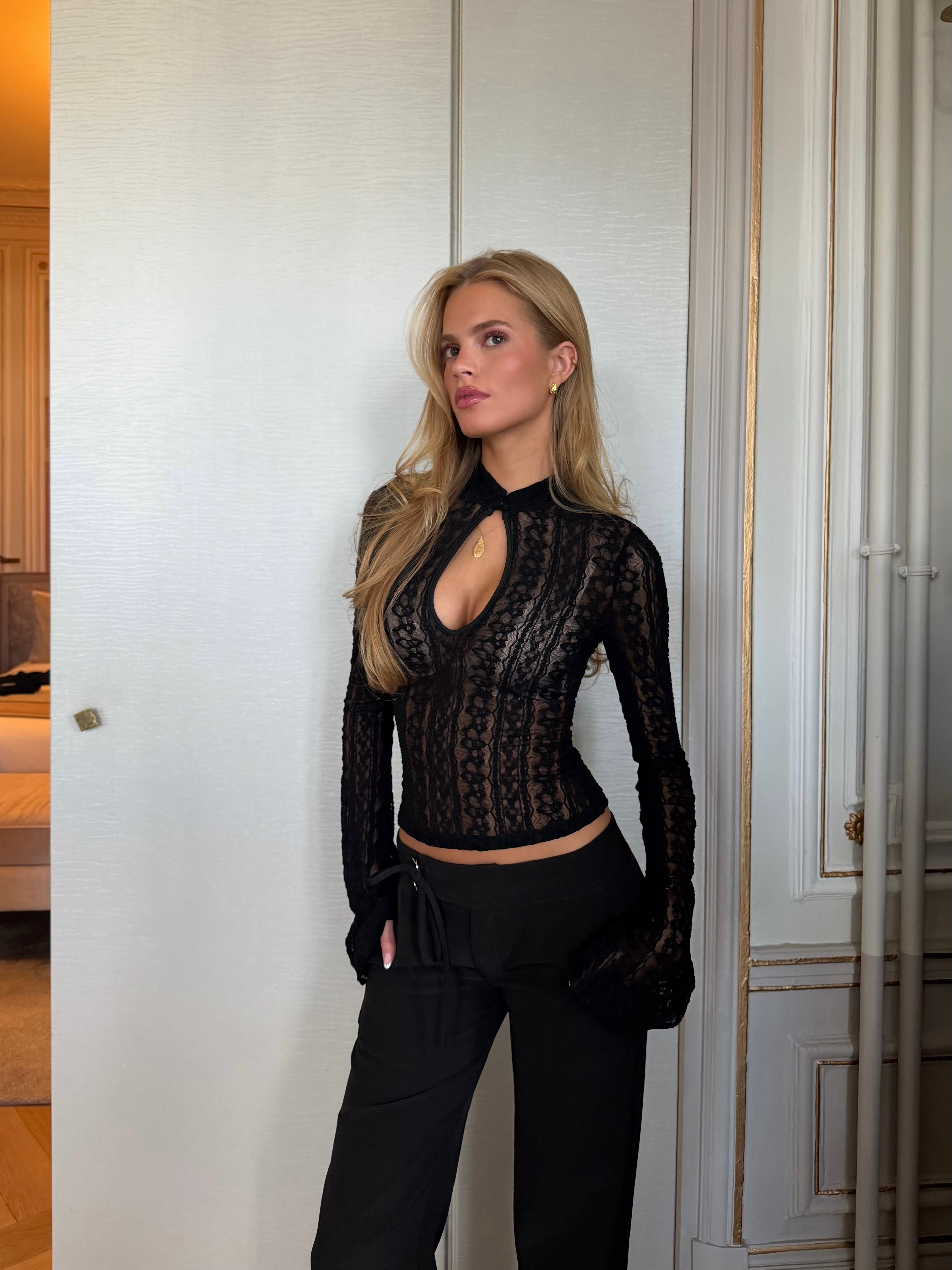 Beautiful lace top made from the softest lace material, featuring a cut-out and button closure. The top has stretch and fits beautifully on the body.