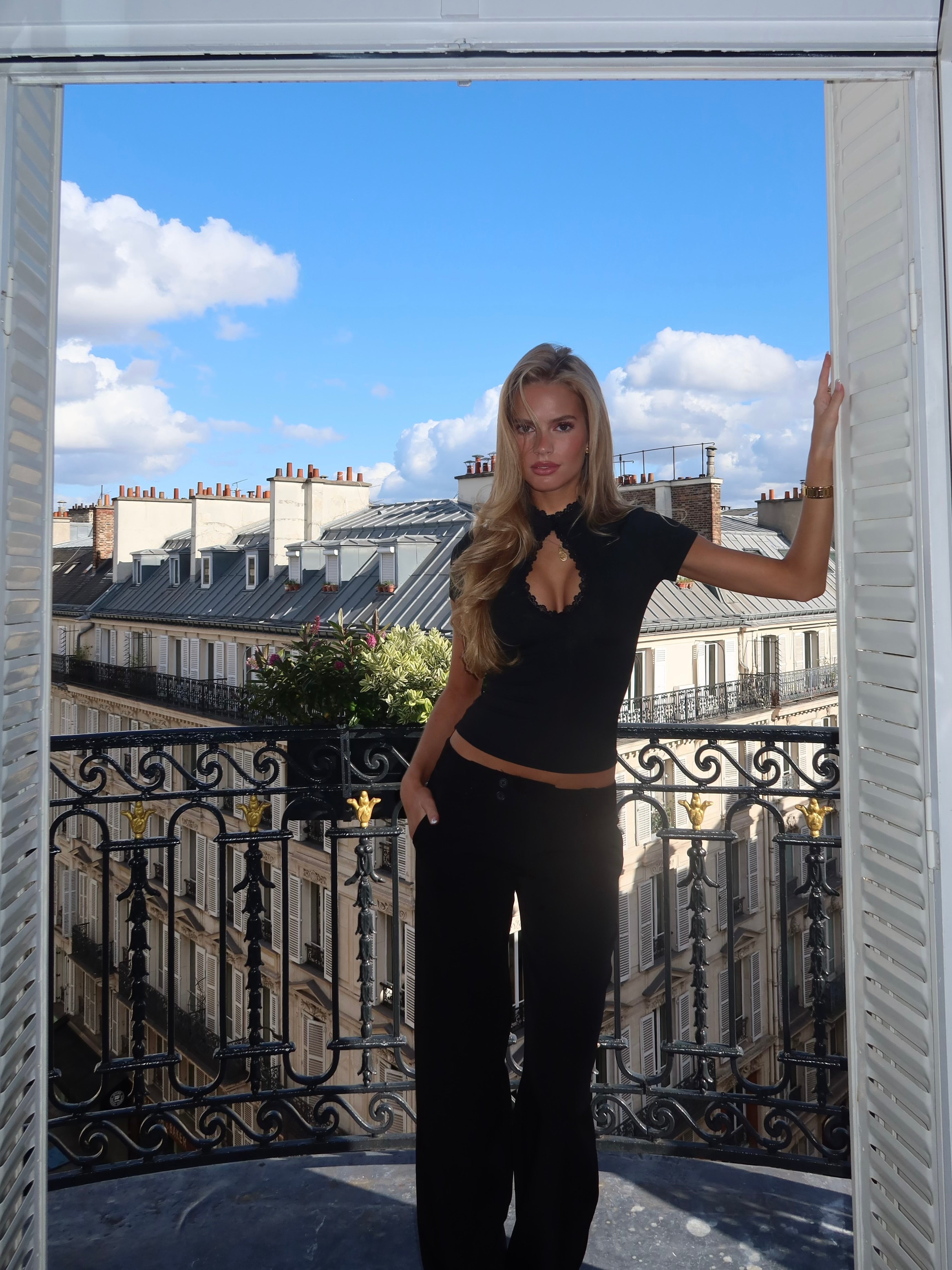 Beautiful basic top with lace, made from the softest material, featuring a cut-out and button closure. The top has stretch and fits beautifully on the body.