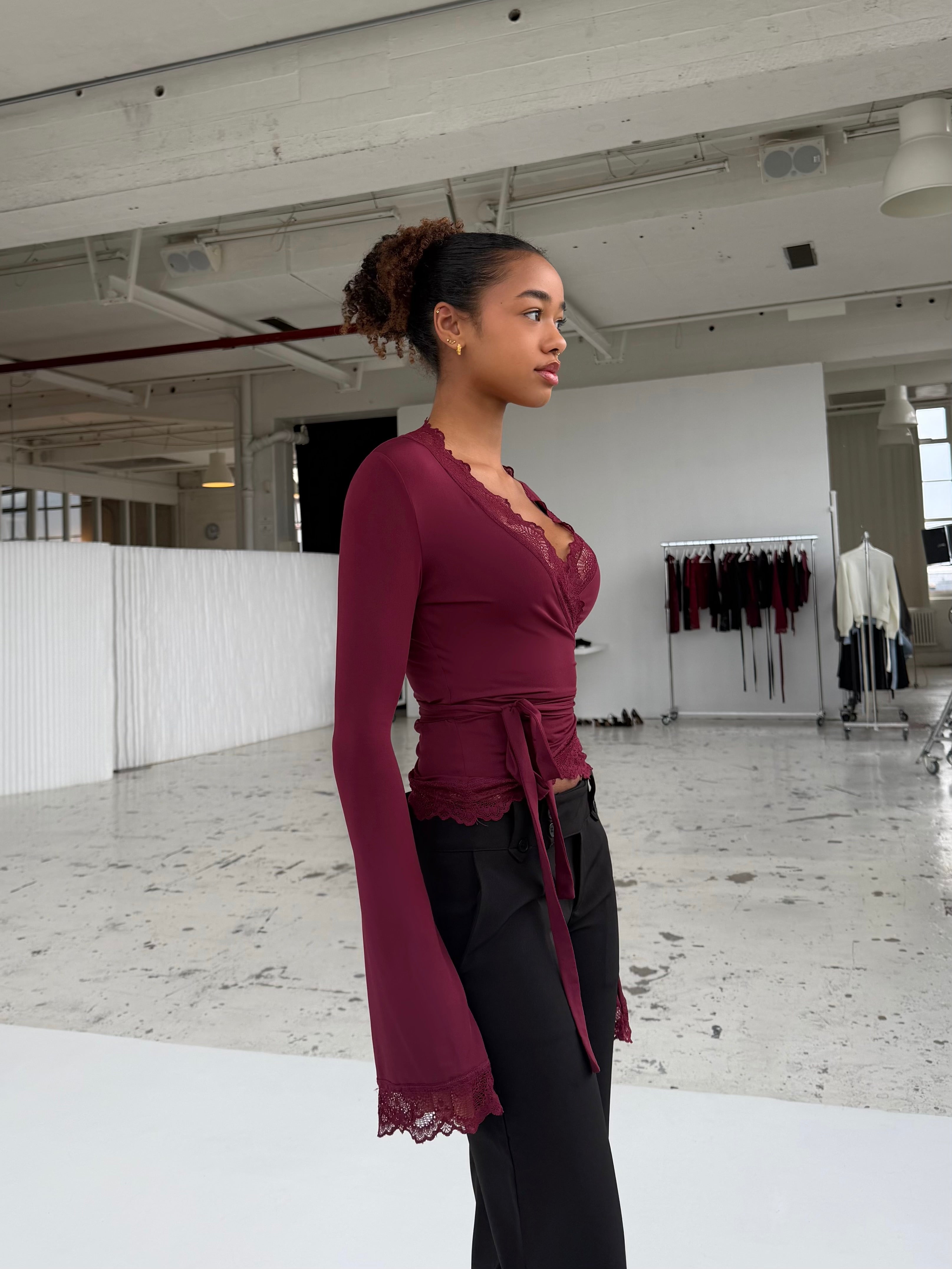 Beautiful wrap top in the softest, very stretchy material that fits beautifully to the body. The top has long sleeves and a deep neckline with lace.