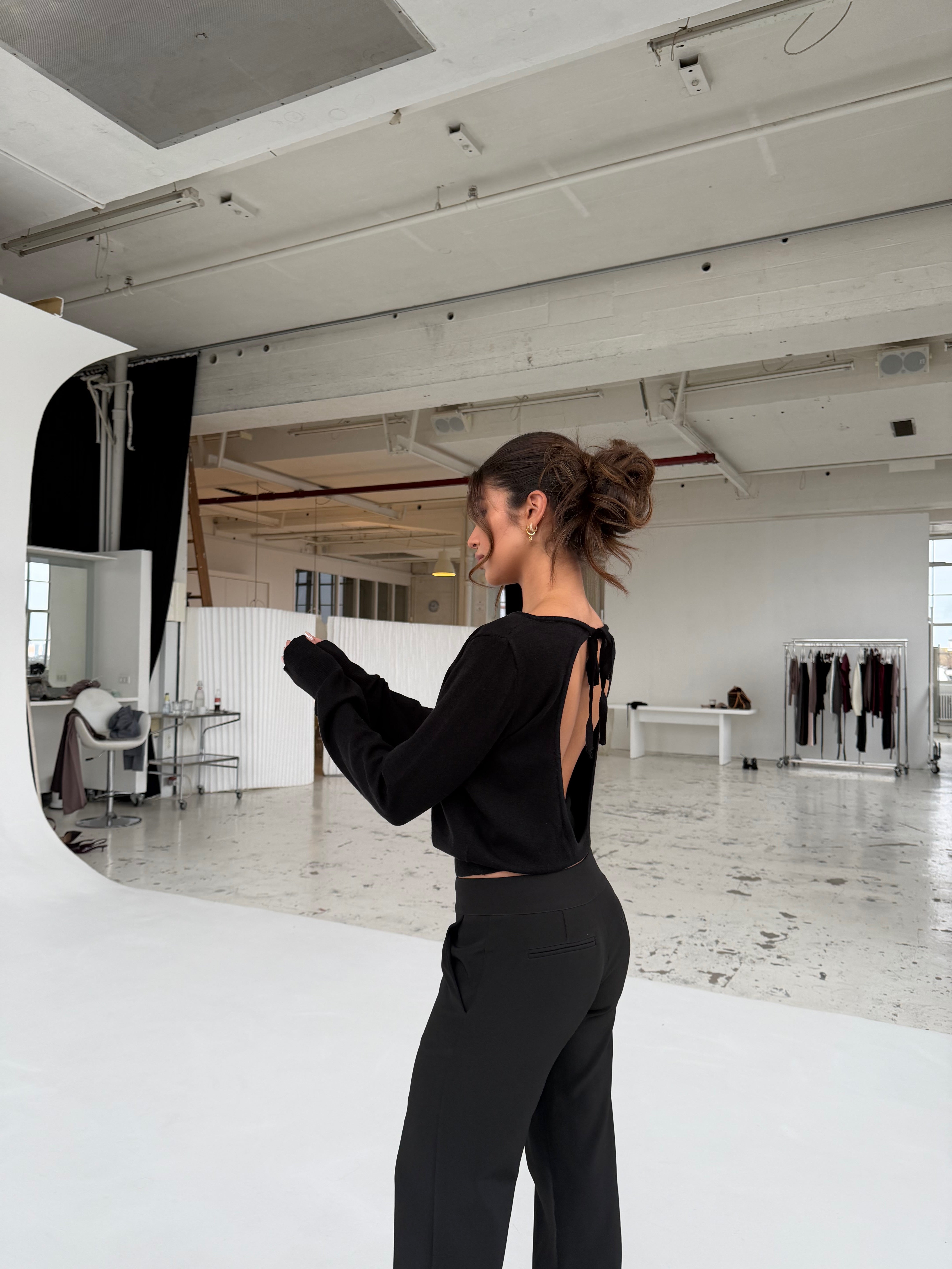 Beautiful knit top in the softest wool blend. The top has plenty of stretch and fits nicely to the body. It features long sleeves and an open back with a tie detail.