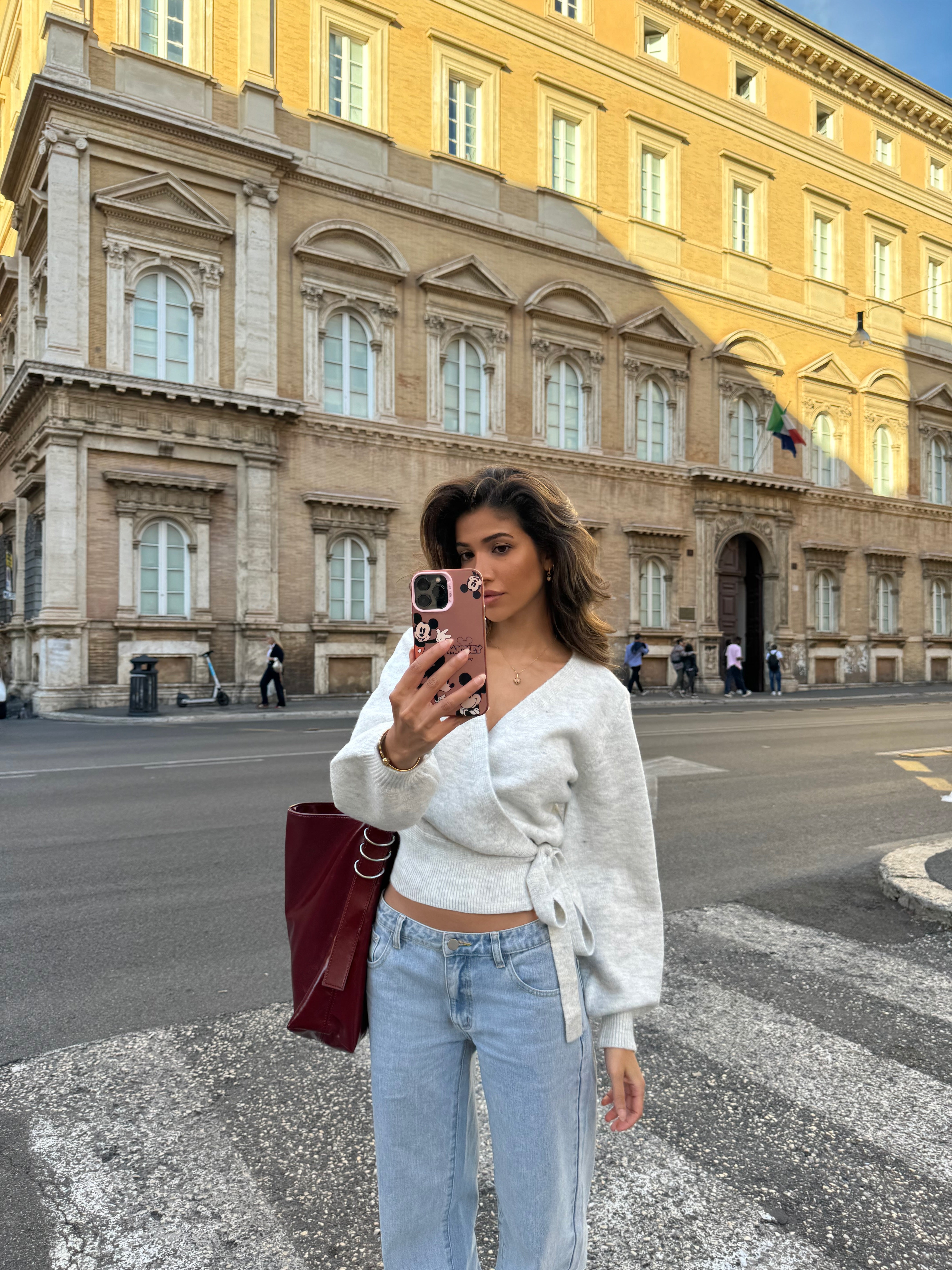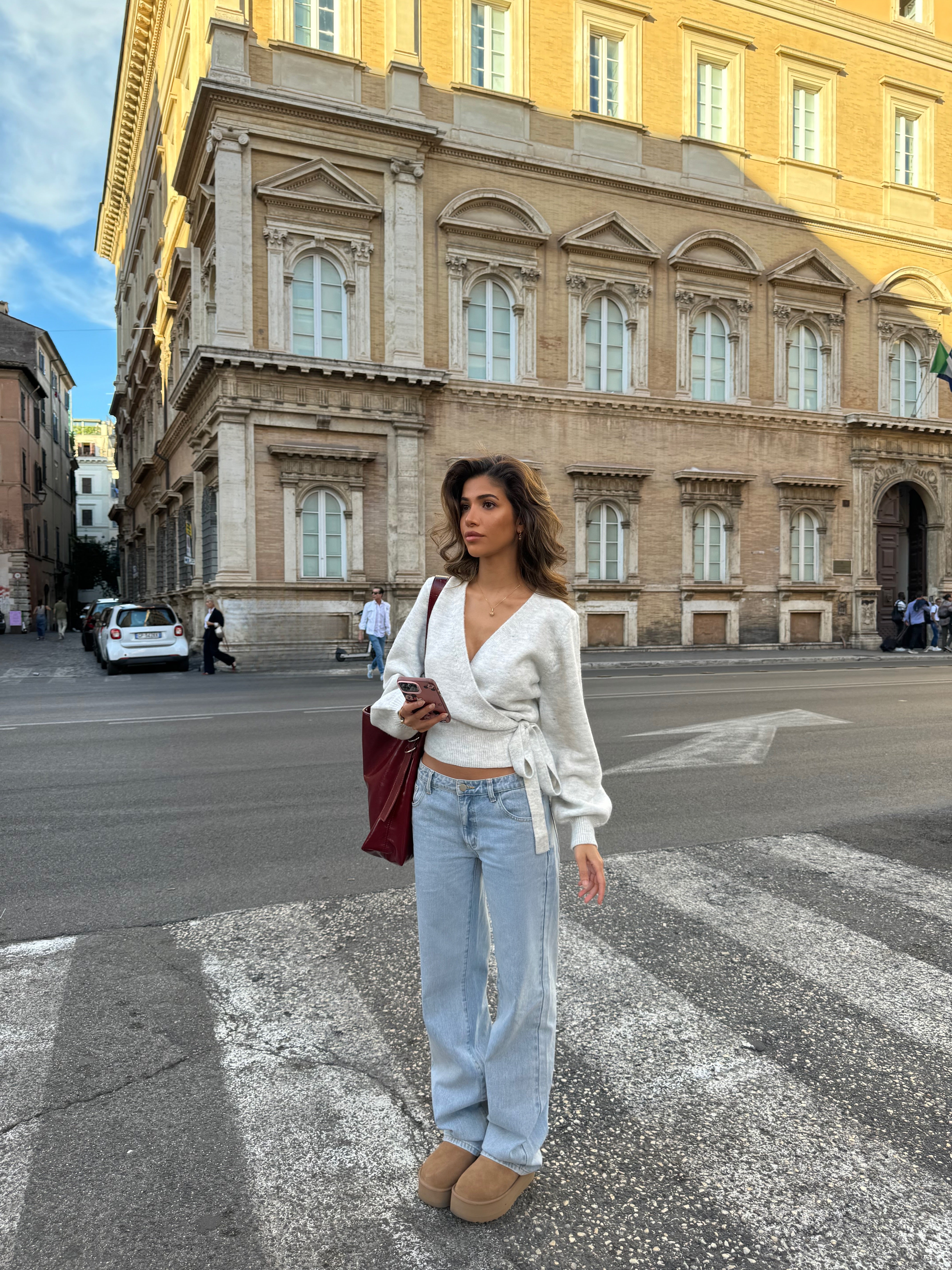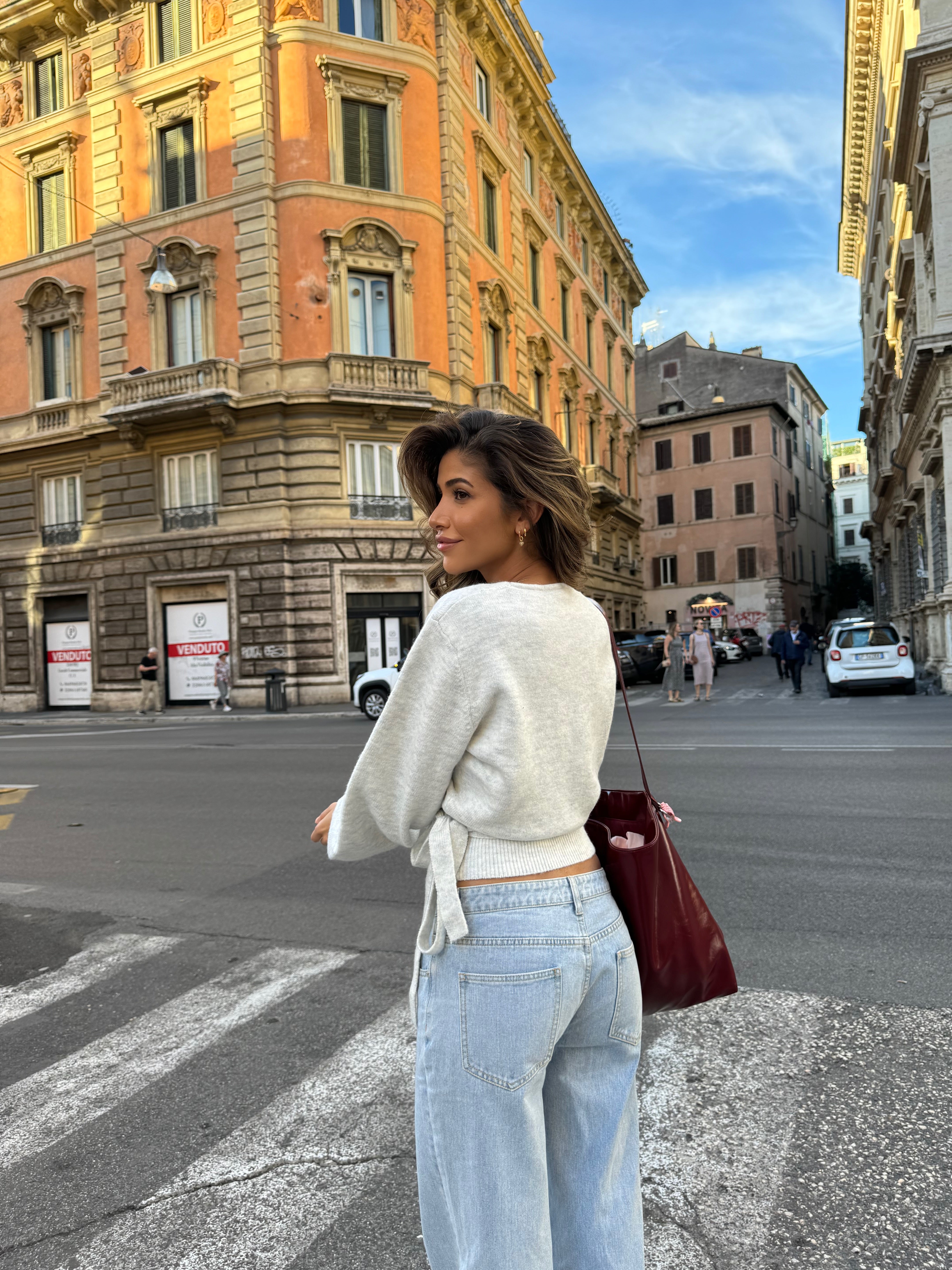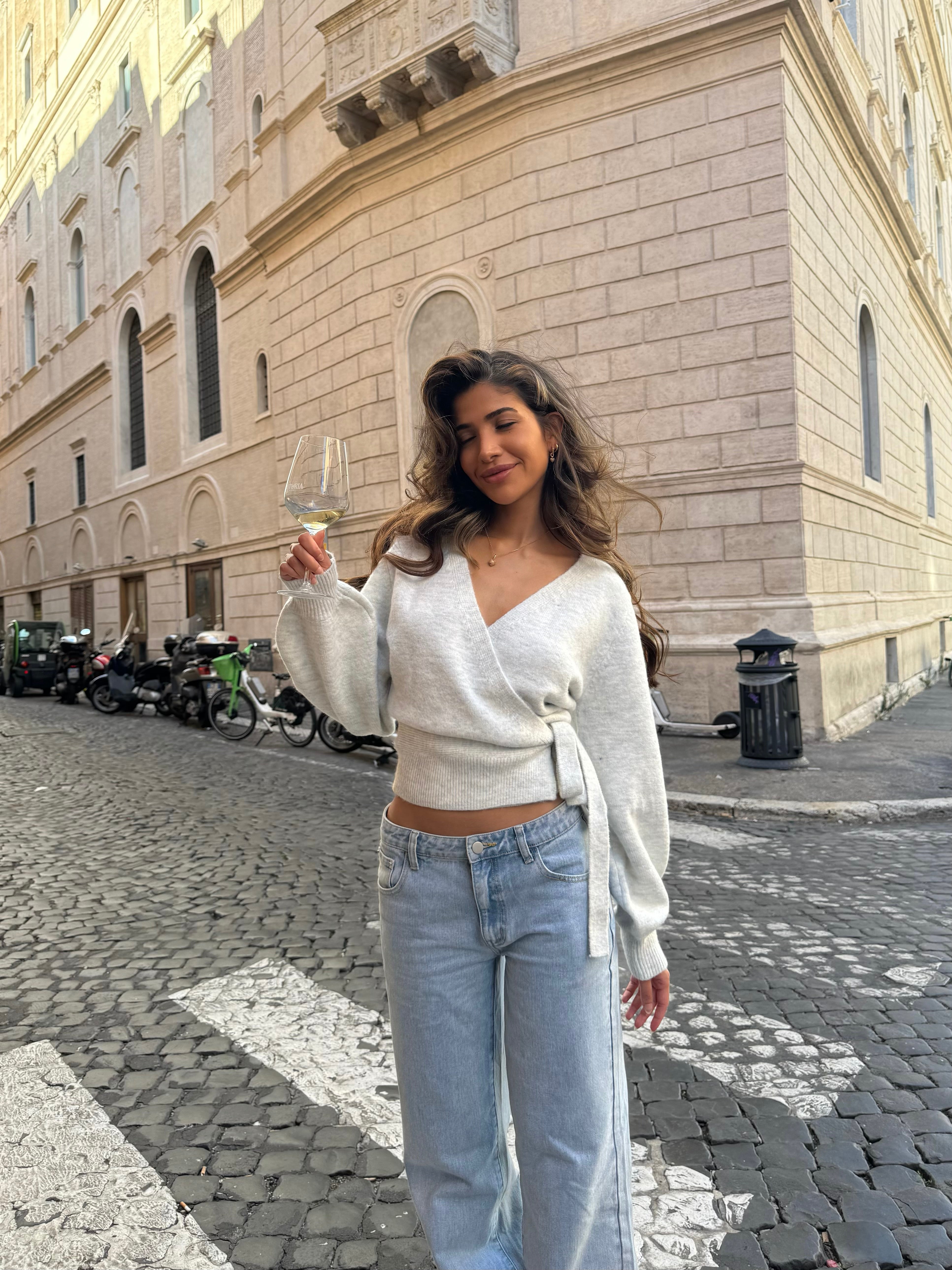 Cardigan in the softest material, made from a wool blend. It is tied at the side and can be tightened as desired.